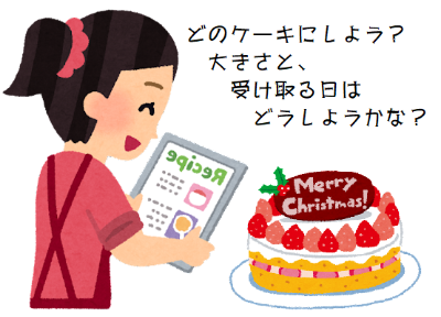 ホームページやチラシを見て、ケーキの種類や大きさ、受け取り日時を、あらかじめ決めておきます
