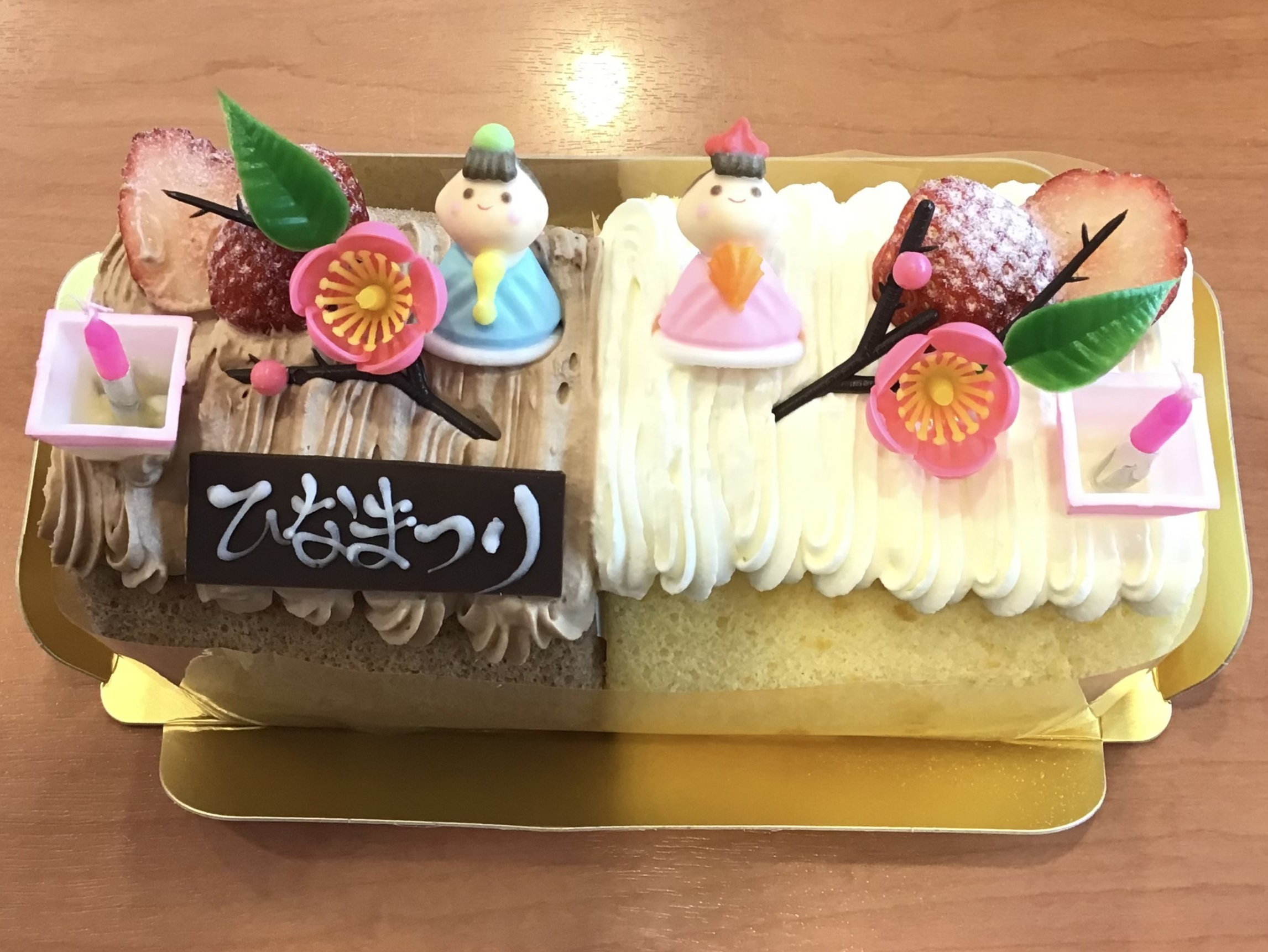 ケーキには、おだいりさまとおひなさま、ぼんぼり型のロウソクなど、