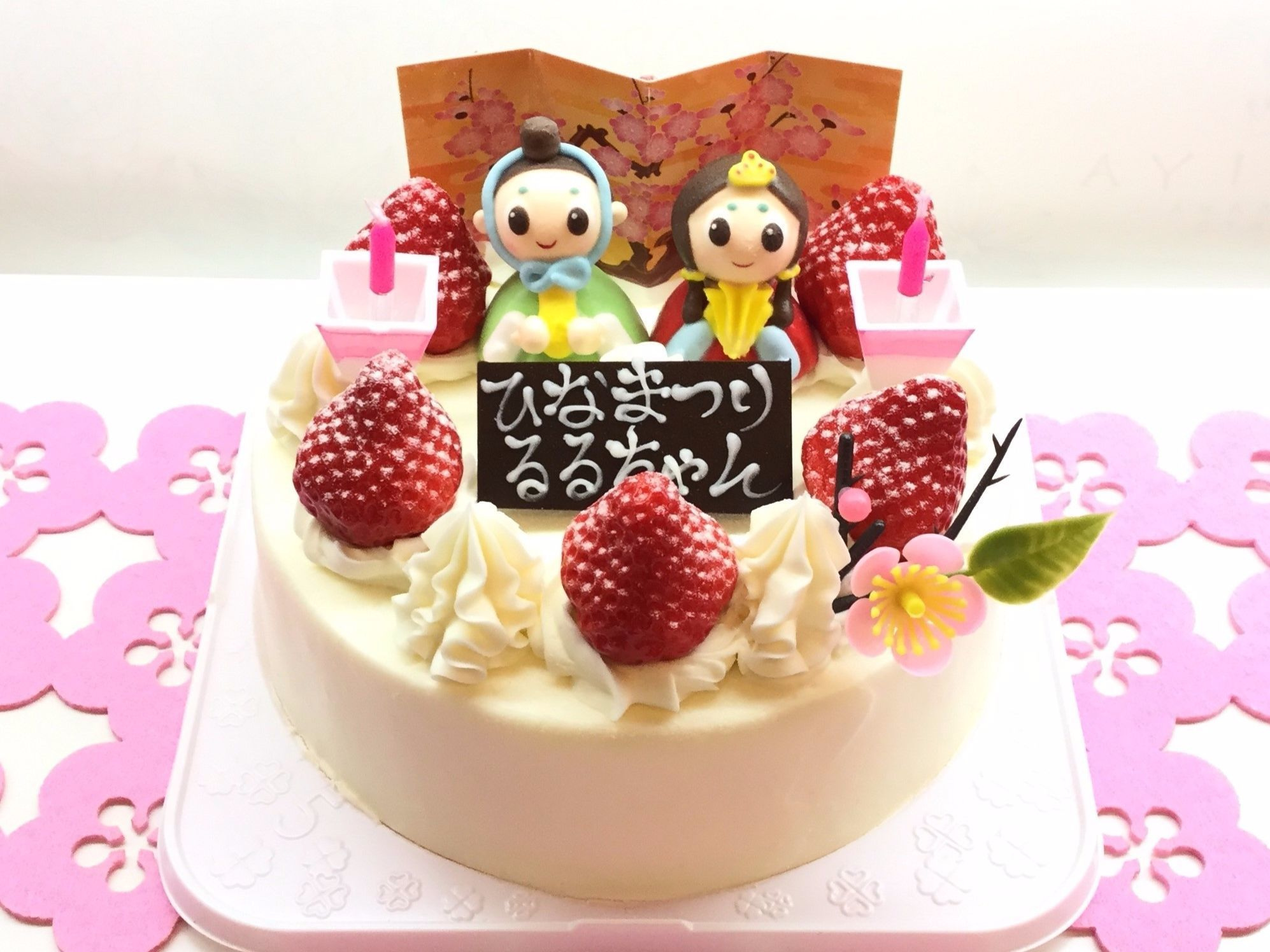 ケーキには、おだいりさまとおひなさま、ぼんぼり型のロウソクなど、